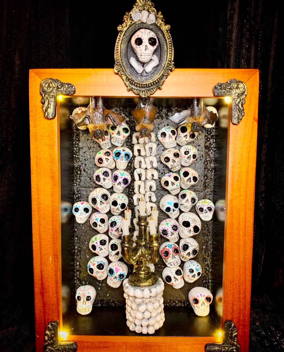This is a project I did for Día de los Muertos. I used crayola air dry clay for all the skulls and bones, and polymer clay for the candelabra and the bats. I crafted the frame on top and corner decorations with air dry foam clay using a silicone frame mold.