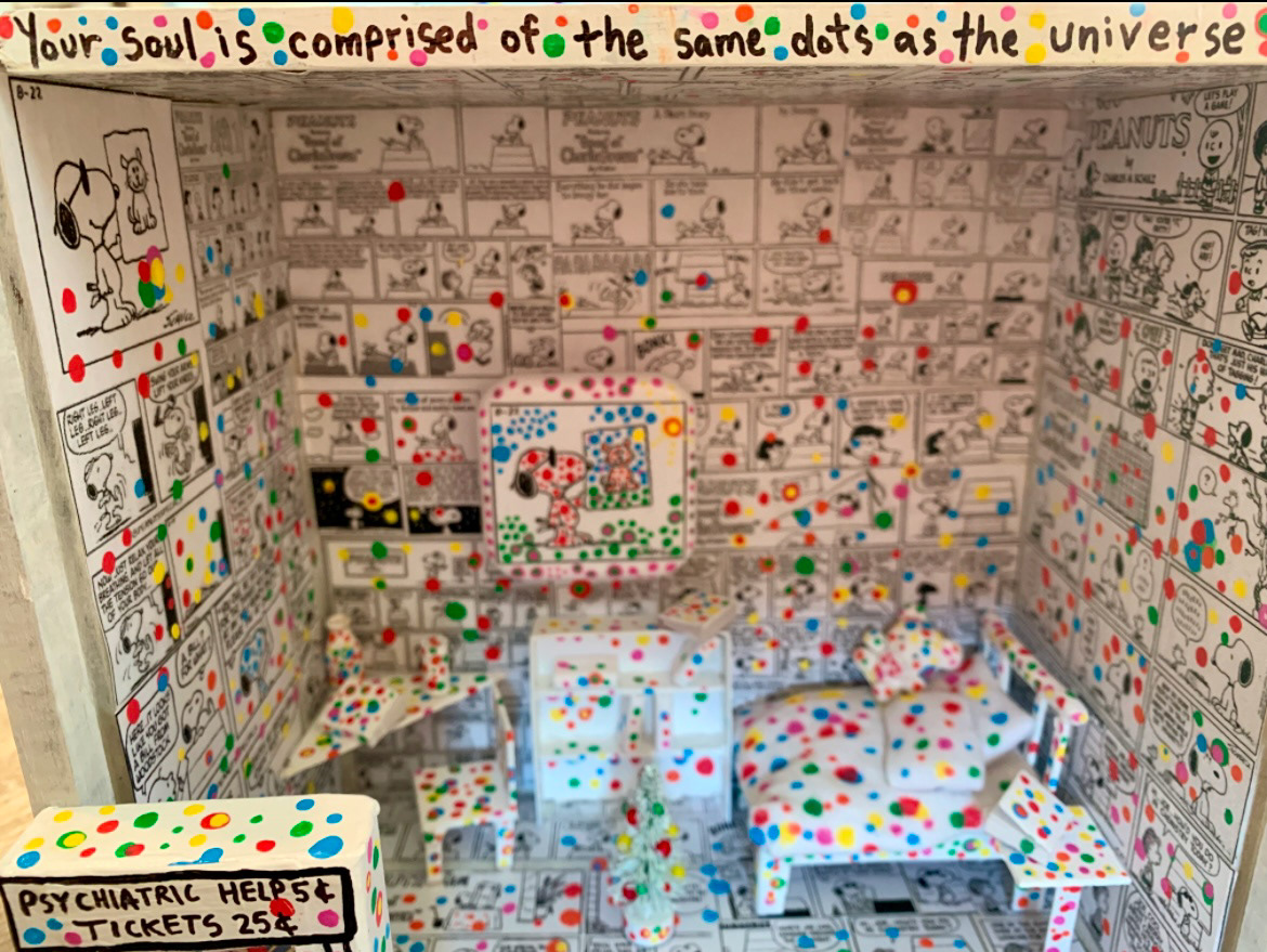 For this project, I was tasked with creating a fusion of the pop culture icon Snoopy and the artist Yayoi Kusama. I designed a diorama depicting Joe Cool’s (one of Snoopy’s many personas) college bedroom, inspired by Kusama's Obliteration Room. My concept involved covering the walls and ceiling with black-and-white Snoopy comics, which created a striking visual contrast when Kusama’s signature dots were applied throughout the space. I hand-crafted the furniture using wooden pieces, cardboard, glue and paint. I added small details like books, a stuffed bear, and beverage containers to capture the essence of a college bedroom. I believe Kusama was an excellent match for Lucy van Pelt’s character.